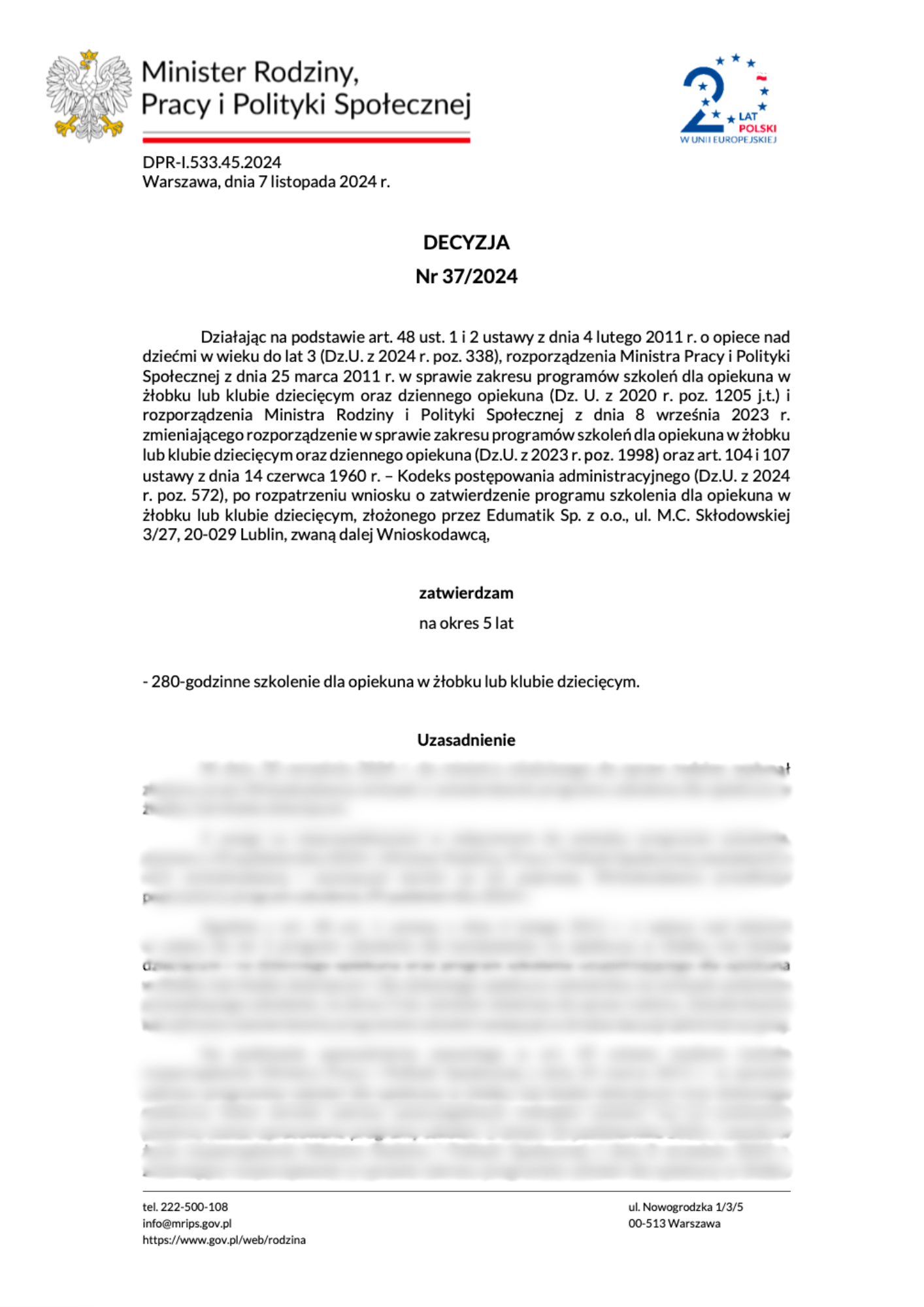 Decyzją nr 37/2024 z dnia 07.11.2024 r. program kursu został zatwierdzony przez Ministra Rodziny i Polityki Społecznej