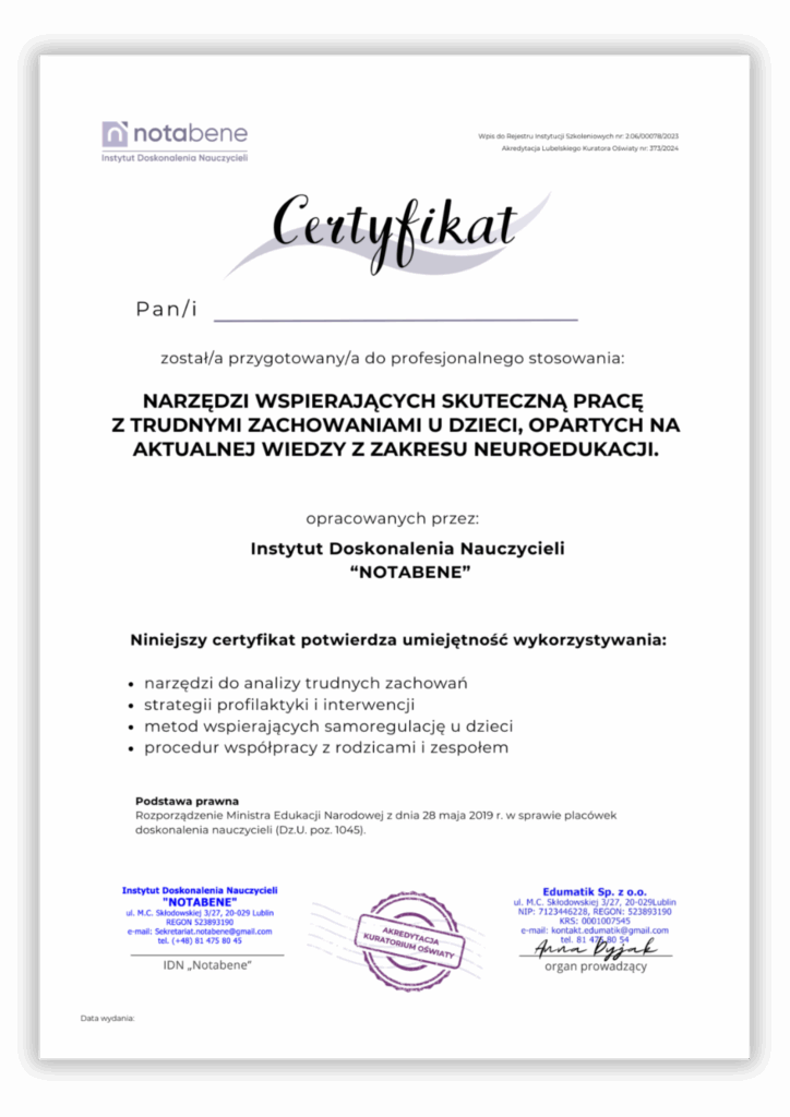 Kupując box terapeutyczny otrzymujesz Certyfikat przygotowania do profesjonalnego stosowania narzędzi wspierających skuteczną pracę z trudnymi zachowaniami u dzieci, opartych na aktualnej wiedzy z zakresu neuroedukacji.